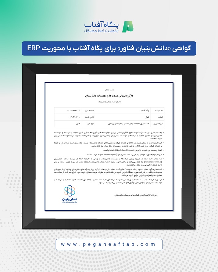 پگاه آفتاب در جدیدترین ارزیابی معاونت علمی، فناوری و اقتصاد دانشبنیان ریاست جمهوری، با راهکار ERP صنعتی خود بار دیگر موفق به کسب و تجدید گواهی «دانشبنیان فناور» شد؛ جایگاهی که بهعنوان بالاترین سطح ارزیابی شرکتها و محصولات دانشبنیان شناخته میشود.
